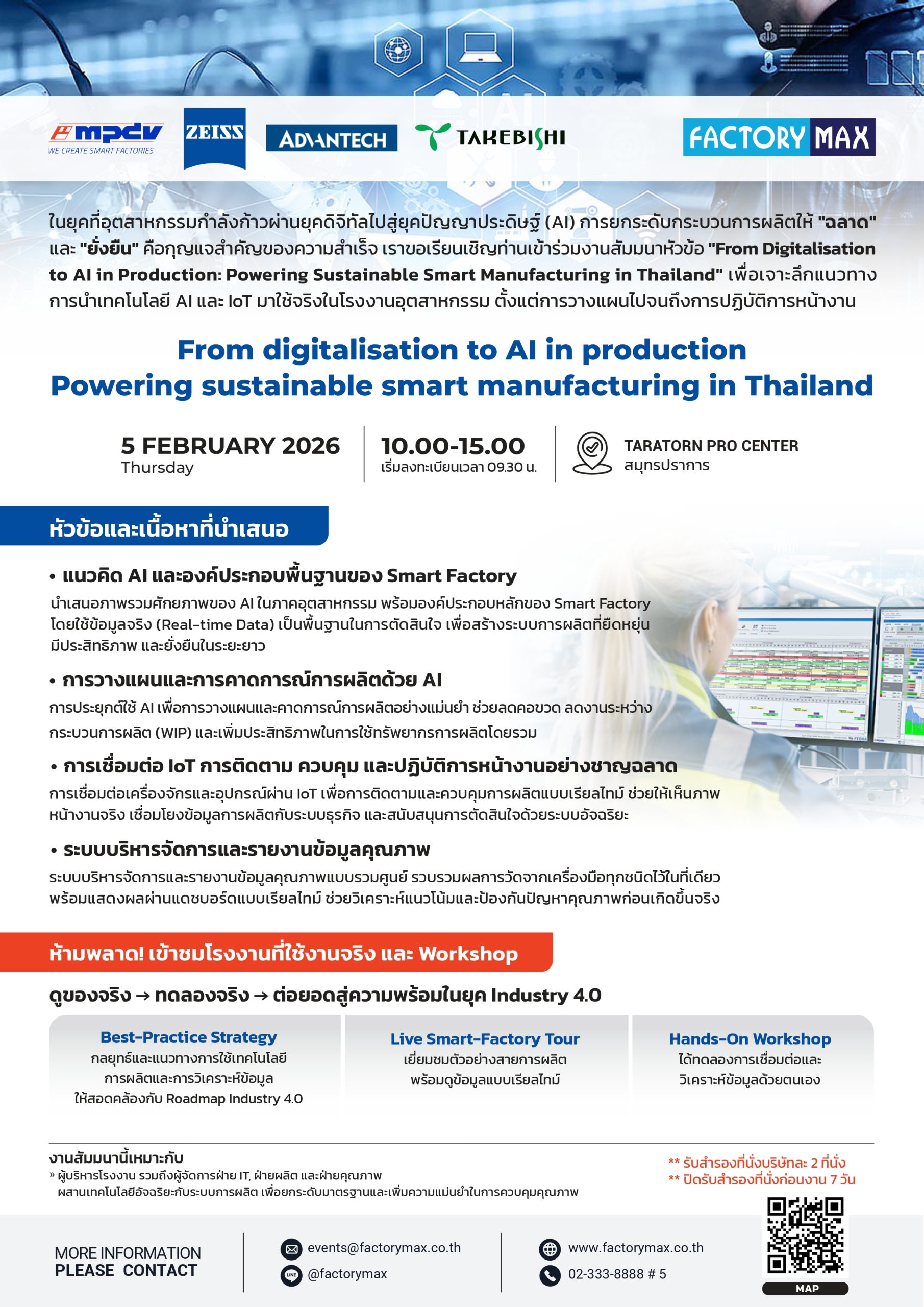 บริษัท แฟ็คทอรี่ แม๊กซ์ จำกัด ร่วมกับ MPDV, ZEISS, ADVANTECH และ TAKEBISHI ขอเชิญทุกท่านเข้าร่วมงานสัมมนาในหัวข้อ
