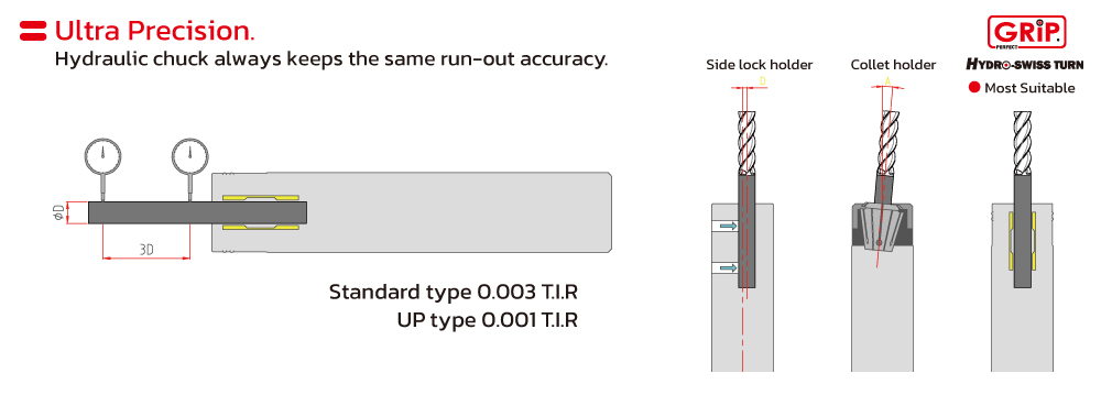 - คุณภาพ : Hydro-Swiss Turn รองรับความสามารถในการทำซ้ำ (Repeatability) ที่ 1 ไมครอน ที่ความยาว L/D = 3D ซึ่งความคลาดเคลื่อนที่ต่ำนี้จะช่วยให้การผลิตเกิดความแม่นยำสูง และช่วยยืดอายุการใช้งานของเครื่องมือตัดให้ยาวนานขึ้น เมื่อเปรียบเทียบกับการจับยึดอื่นๆ สำหรับเครื่องกลึงขนาดเล็ก Hydro-Swiss Turn สามารถตอบโจทย์ความเที่ยงตรงและแม่นยำในการจับยึดมากกว่าระบบอื่นๆ