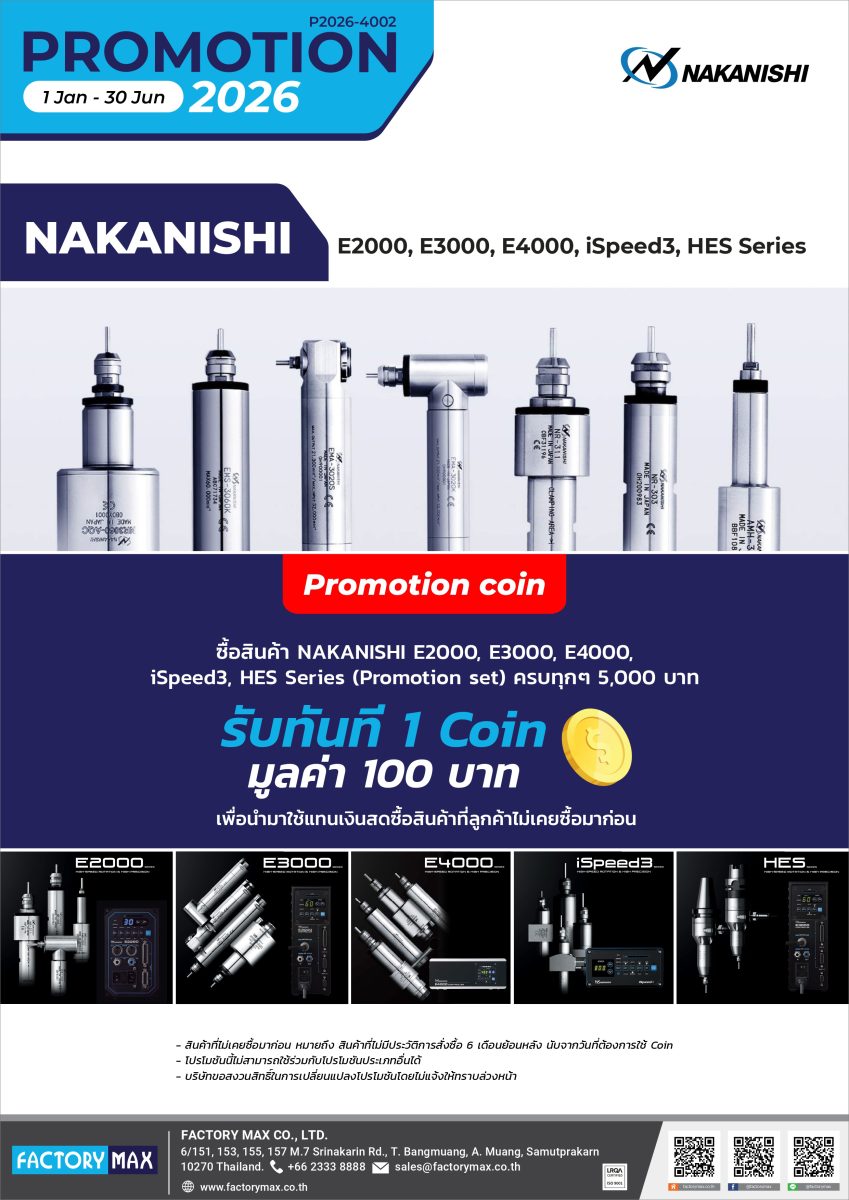 ซื้อสินค้า Nakanishi E2000, E3000, E4000, iSpeed3, HES series (Promotion set) ครบทุก ๆ 5,000 บาท (จากส่วนลดมาตรฐาน 35%) รับ 1 coin มูลค่า 100 บาท เพื่อใช้แลกซื้อสินค้าที่ลูกค้าไม่เคยซื้อมาก่อน
